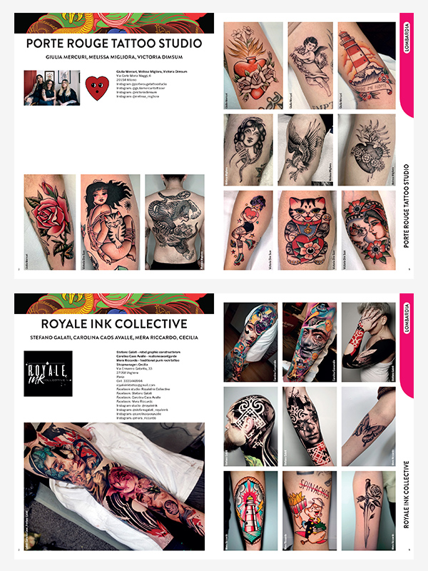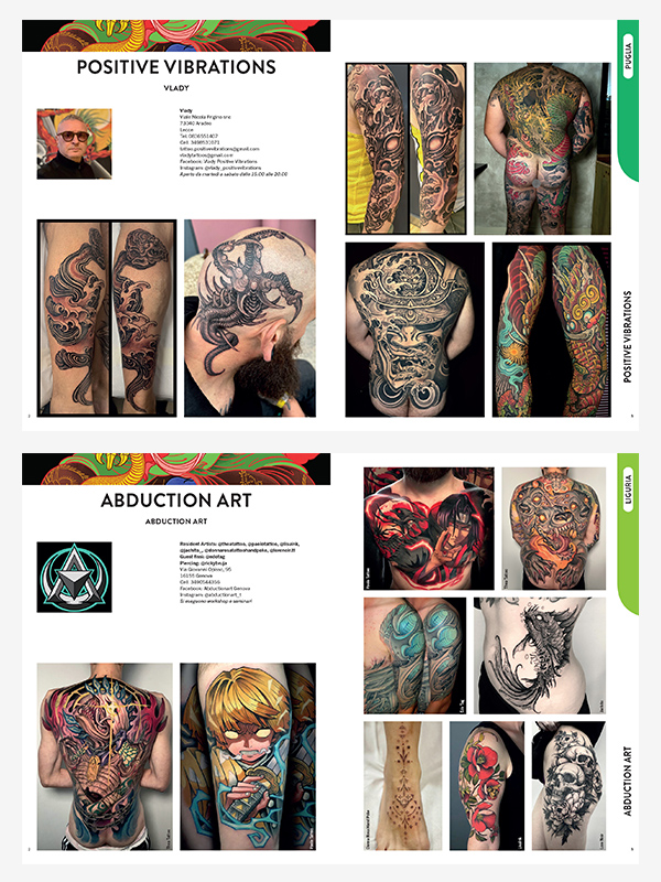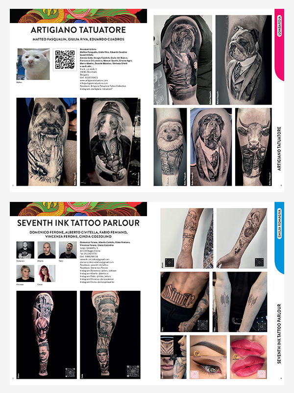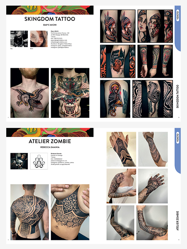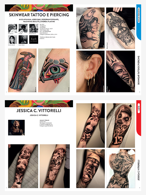 The Yearbook is a “neutral” paper volume, open to all professionals practicing in Italy, a magazine printed with great care, a communication channel between those who propose and those who seek. For the reader it is a clearly organized collection of more than 2,000 tattoos, in all the styles present today, and a complete overview that has its own well-defined boundaries of over 400 pages on what tattooing offers today in different regions, cities, all over Italy.