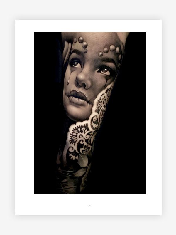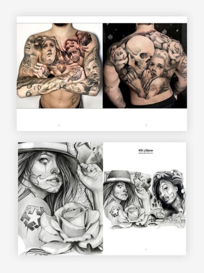 288 pages of tattoos, photographs and drawings outline the creative and artistic evolution of one of the most popular tattooists among lovers of fine line Black and Grey. Women, Christian symbolism, money and power come together in his pieces with lettering and mottos from the street.