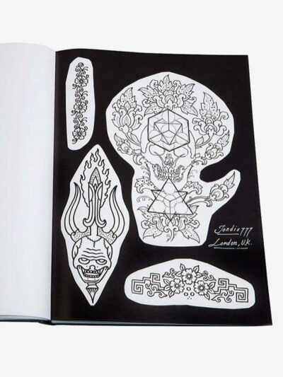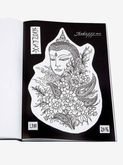 This collection of flash can be used as a source of inspiration. It’s a valuable tool which Jondix wished to offer to every tattooist who loves this iconography, and it takes the reader on an incredible tour through the most authentic symbolism and iconography of these ancient cultures. Mudras, landscapes, animals, plants, dragons, and mythical creatures, over 1000 subjects, designed with simple black lines which Jondix assembles to create mythological scenes or simple, everyday, ornamental images.