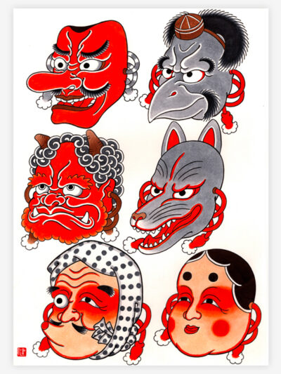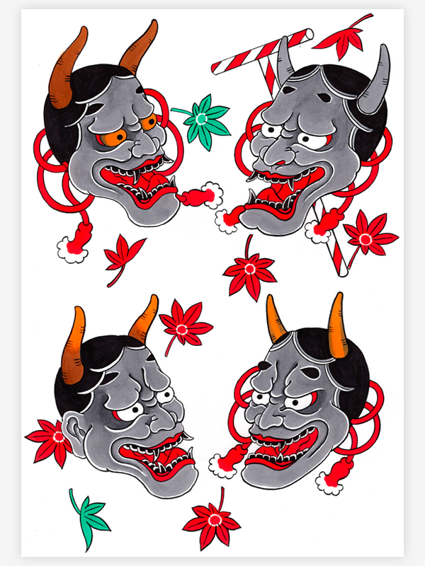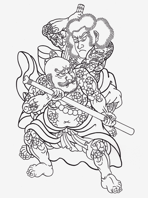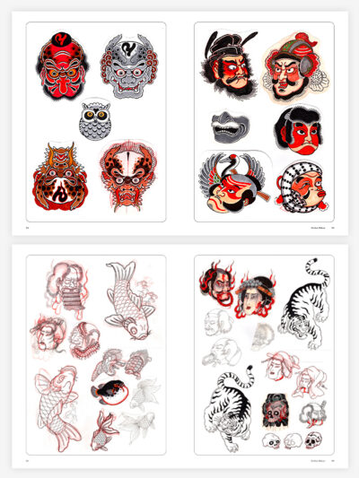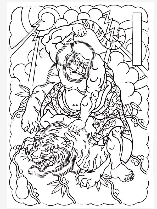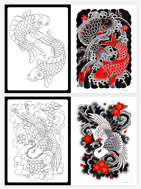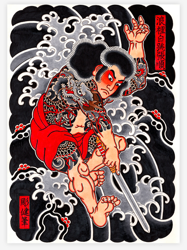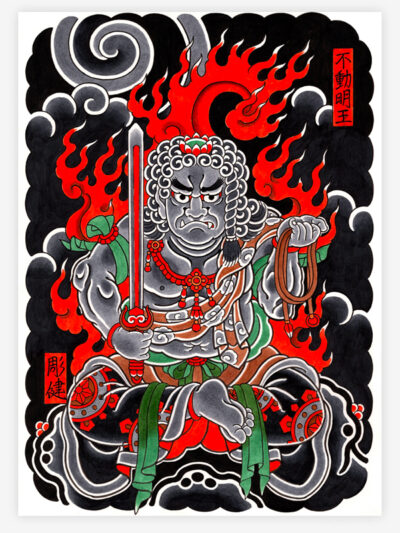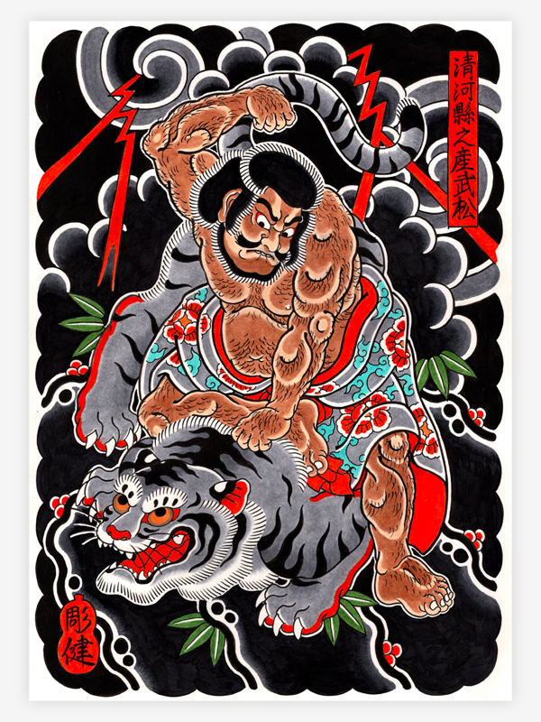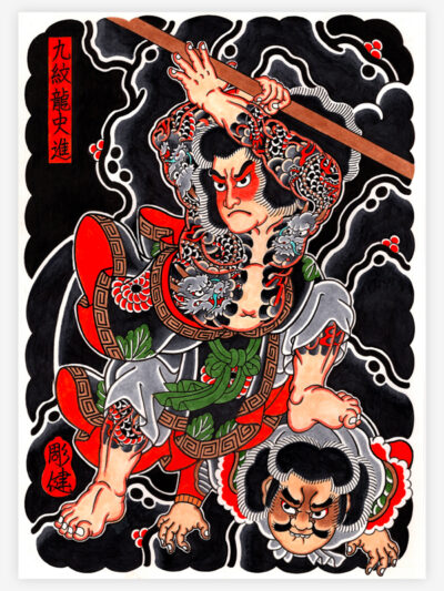 His designs are vibrant tales that blend mythology with classical Japanese backgrounds: air, water, and rock, which Horiken flattens and stylizes in a graphic manner, presenting a contemporary version of his style. The recurring themes draw heavily from classical Japanese iconography: ancient samurai warriors, koi carp symbolizing resilience and transformation, mythological figures like Oni (demons), and protective deities.