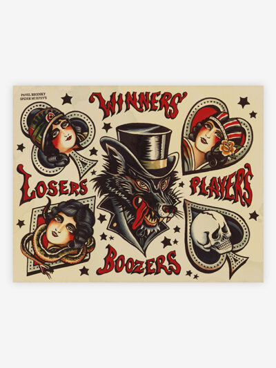 The subjects are the beloved classics of this distinctly retro style: circus women, tigers, playing cards, gentlemen in bowler hats, spiders, felines and compositions which bring to mind the images on the advertisements for old tattoo shops.