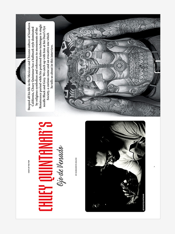 Chat at the top with Chuey Quintanar, from Los Angeles his religious subjects and Chicano themes in black and grey;