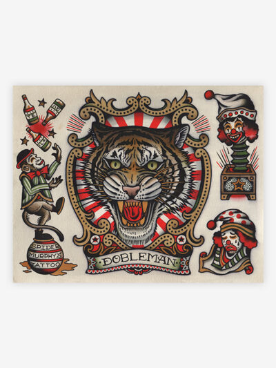 The subjects are the beloved classics of this distinctly retro style: circus women, tigers, playing cards, gentlemen in bowler hats, spiders, felines and compositions which bring to mind the images on the advertisements for old tattoo shops.
