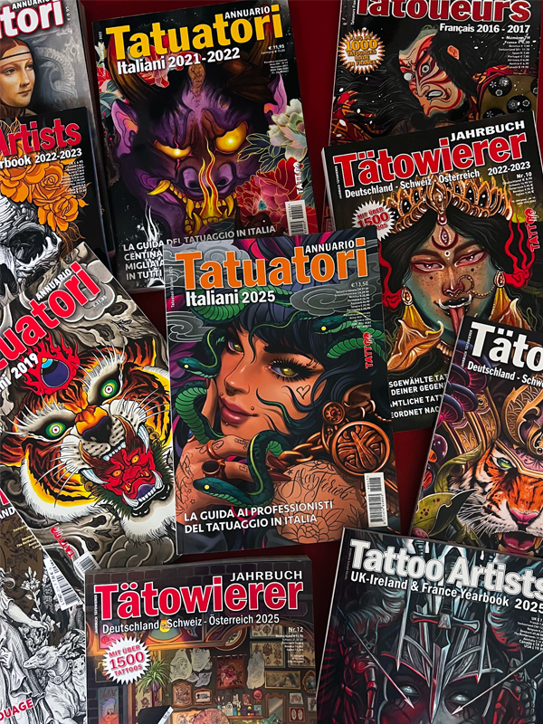Buy a Yearbook Surprise Pack and receive 5 copies of our yearbooks from different countries: Italy, France, UK, Spain, and Germany. Each yearbook is from a different year, offering a unique look at the tattoo scene over time. This is a great way to explore thousands of tattoo images in various styles and discover the tattoo landscape in different countries, including studios and artists.